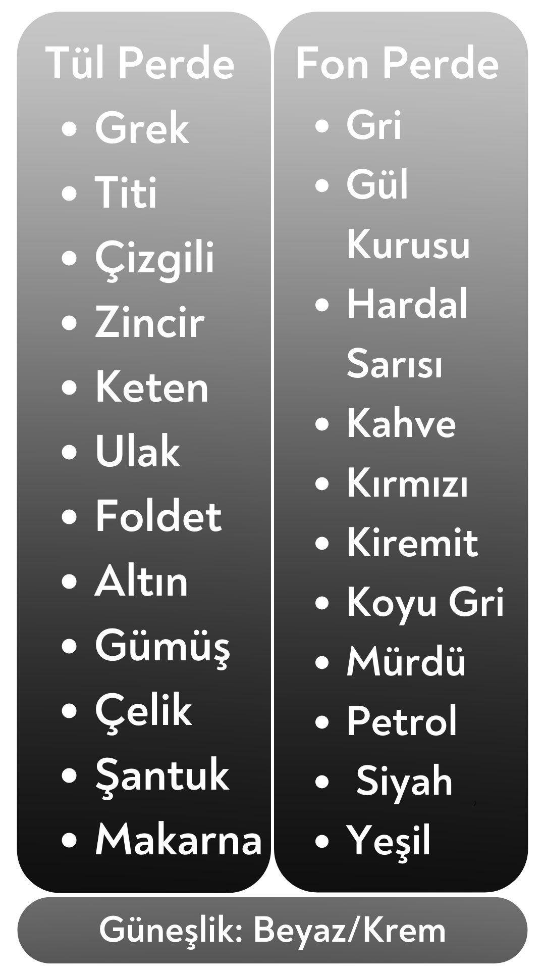 Tül perde için 12 farklı model, fon perde için 11 farklı renk ve güneşlik için 2 farklı renk seçeneğiniz mevcuttur.
